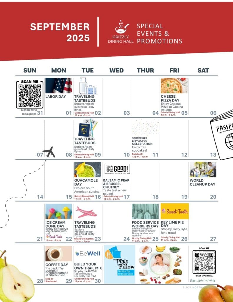 It’s September, Grizzlies! New month, new flavors, and fresh events at Grizzly Dining. Check out this month’s calendar so you don’t miss a bite!